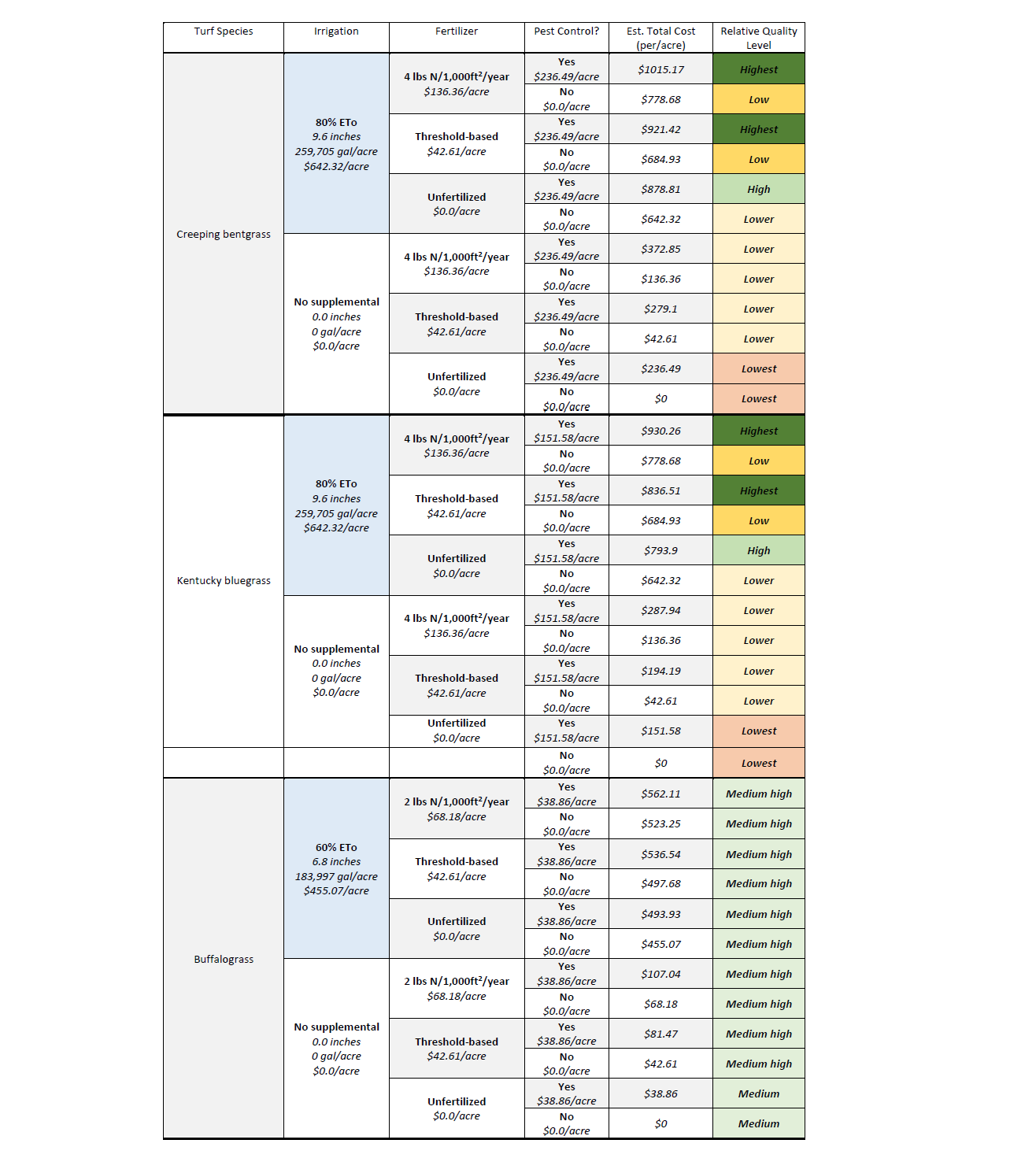 The best quality plots in 2017 were the creeping bentgrass and Kentucky bluegrass with ET-based irrigation, standard or threshold-based fertilizer applications, and standard pest control strategies. All of the possible buffalograss management scenarios were rated only slightly lower. Regardless of management regime, buffalograss provided average quality that has been similar to, and only slightly less than, more intensively managed cool-season grasses. Buffalograss fairways may not be for everyone, but investing in a conversion may be worthwhile for facilities struggling to fund fungicide and water budgets.