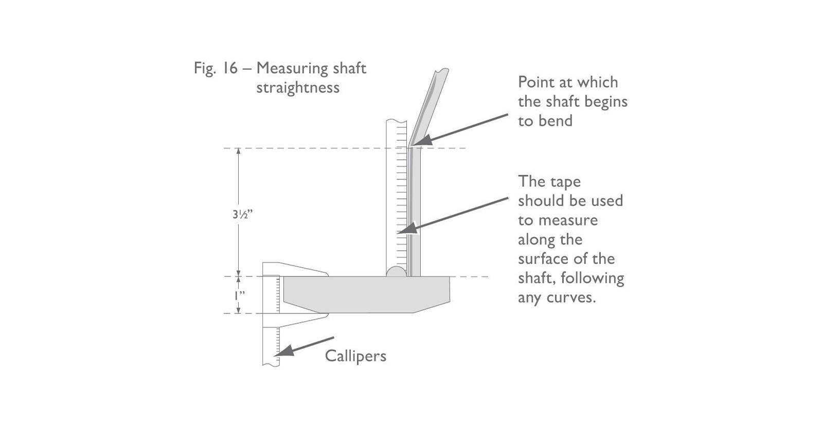 The “5-inch” measurement should be made using a pair of callipers (to measure the depth of the head at the point where the shaft is attached) and a flexible measuring tape, or a piece of string (to measure the length of any bend or bends in the shaft from the point where the shaft ceases to be straight) (see Figure 16).
