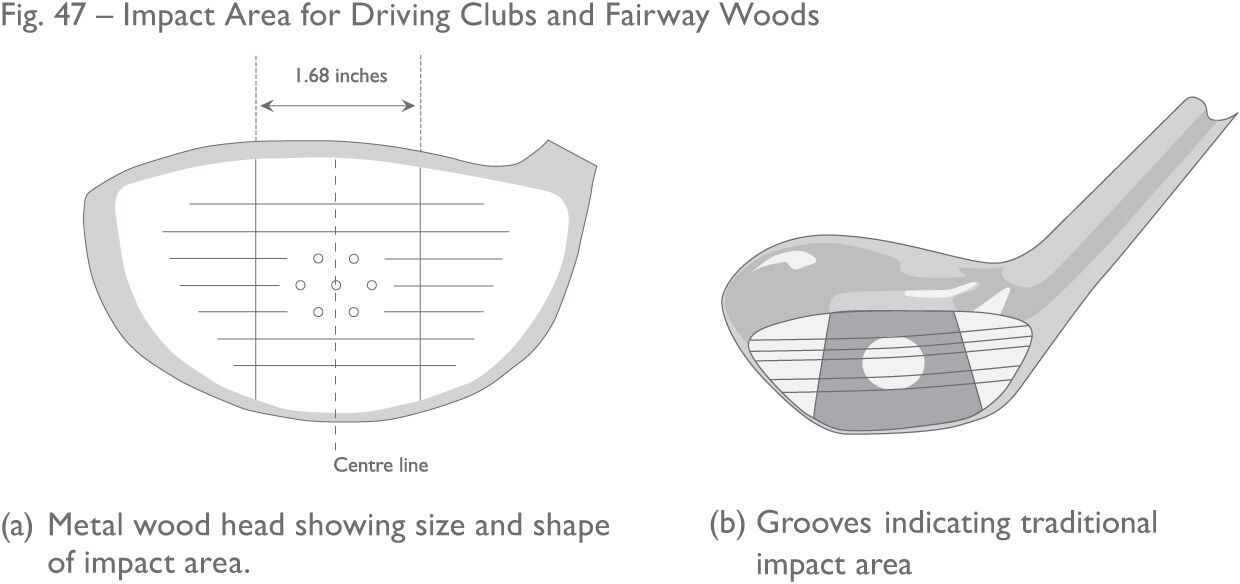 The impact area on driving clubs and fairway woods is deemed to be the central strip down the middle of the clubface having a width of 1.68 inches (42.67 mm) – see Figure 47a.