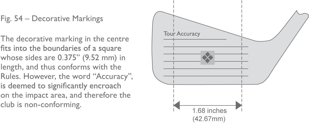 This provision permits small, decorative logos in the centre of the face or at the side of the impact area (see Fig. 54). Decorative markings or logos that marginally encroach on the impact area, i.e. by less than 0.25 inches (6.35 mm), may be permitted. However, any such markings must not be designed to unduly influence or have the effect of unduly influencing the movement of the ball. Markings outside the impact area which are designed to influence the movement of the ball when it has been mis-hit would be contrary to this provision.